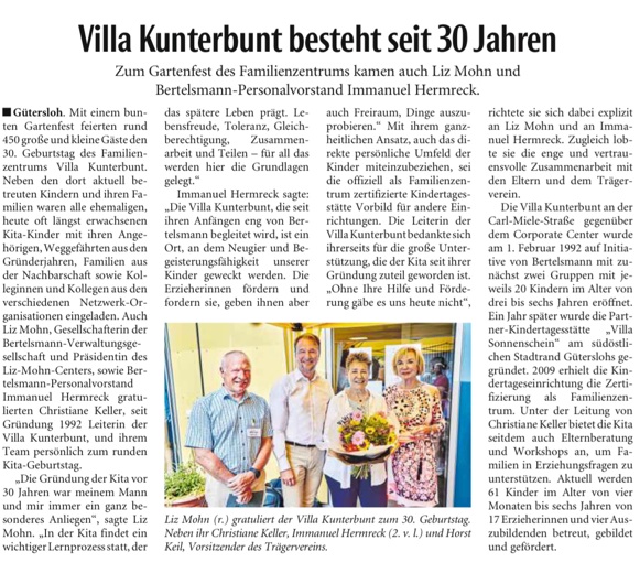 Das Gütersloher Familienzentrum Villa Kunterbunt feierte seinen 30. Geburtstag. Zum bunten Gartenfest waren auch Liz Mohn, Bertelsmann-Personalvorstand Immanuel Hermreck und Horst Keil, Vorsitzender des Trägervereins, gekommen. Zusammen mit rund 450 großen und kleinen Gästen gratulierten sie Christiane Keller, seit Gründung 1992 Leiterin der Villa Kunterbunt, und ihrem Team.